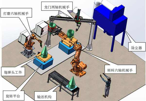 主罩体毛坯件打磨工作站:两轴龙门机械手+打磨六轴机械手+移料六轴机械手