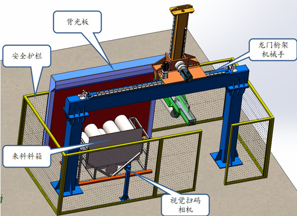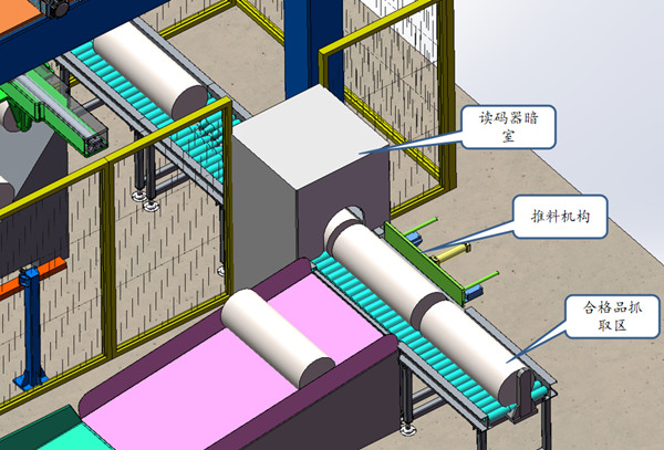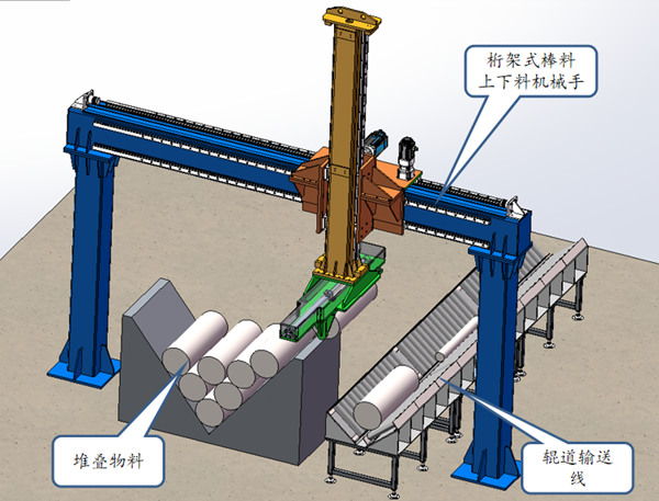 利用桁架机械手抓取圆棒料并放到辊道输送线上,不合格品自动输送到不合格品料箱,过程实现自动化;