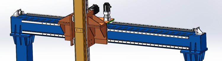 桁架机械手X轴沿单梁布置,采用直线导轨滑行,采用单电机驱动,齿轮齿条传动。