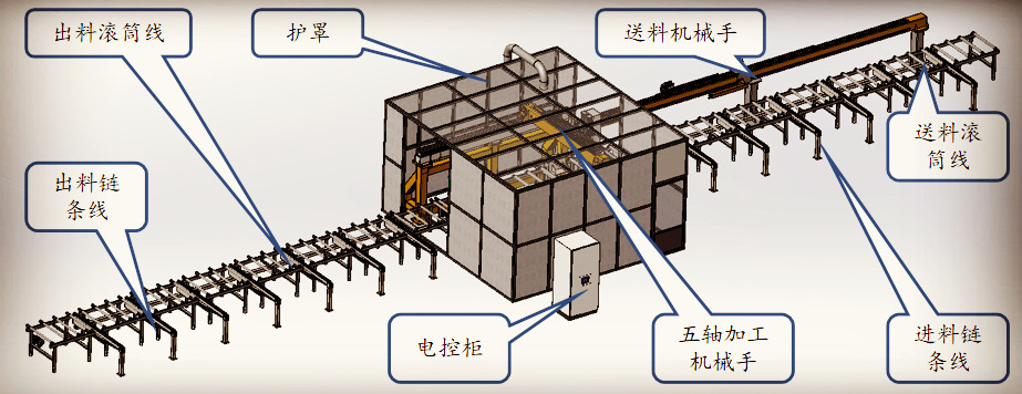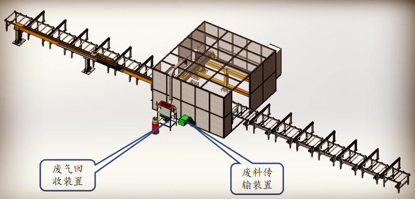 方案由进料链条线(带升降)、进料滚筒线、五轴机械手、自动夹紧装置、废料回收装置、废气回收装置、出料链条线(带升降)、出料滚筒线安全防护系统及电气控制系统组成。
