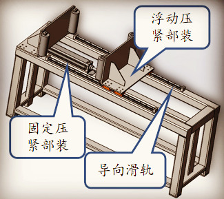 夹紧部装主要由机架、固定压紧部装、压紧夹紧部装、导向滑轨组成,压紧部装带有无动力辊筒,保证压紧后工件扔可沿进出料滚筒移动顺畅移动。