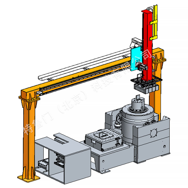 利用二轴桁架机械手,实现机床上下料,自动抓取工件按设定位置的移动。行走部分通过直线导轨导向,齿轮齿条驱动。