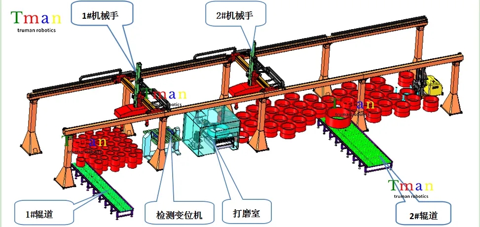桁架机械手厂家排名情况,特鲁门科技有限公司,码料机械手由1#机械手、2#机械手、夹具、检测变位机工装、电控系统等部分组成。