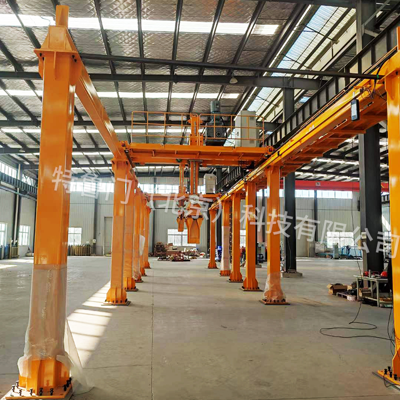 该桁架机械手是二轴双Z轴桁架机械手,在多个工位之间抓取搬运钢坯,搬运放置到指定位置。