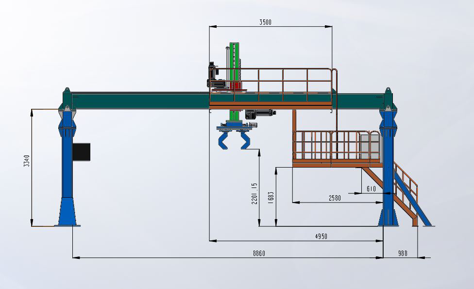 整体实施方案是由立柱、主横梁、小梁、Z轴、抓手、电气控制系统等组成。