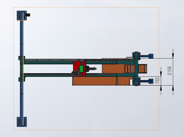 小车梁采用厚壁矩形钢管为主体,上面布置导轨齿条,导向为线性滑轨;大梁采用矩形钢管,一端大一端小,Z轴坐在两钢管之间;X轴采用齿轮齿条传动;Z轴采用齿轮齿条传动。