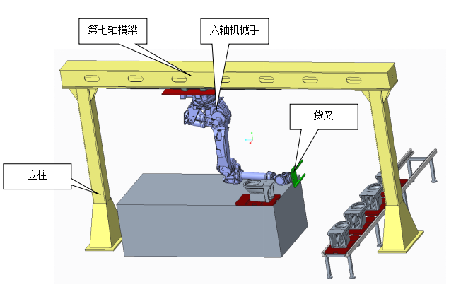 本桁架机械手整体实施方案是立柱、横梁、六轴机械手、电气控制系统等组成。