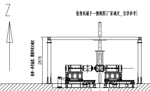 2、桁架机械手二:卷重约1吨,头部配备抓取部件,含X方向横移轴,Z方向伺服升降轴,机械夹爪。