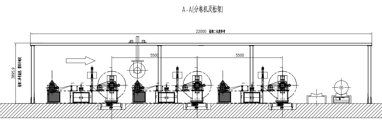 该条生产线中,卷材由取卷机处下线,经桁架机械手一搬运至三台运卷车上;然后运卷车运送卷材到分卷机上,由分卷机进行分卷;分卷机分卷后,再由桁架机械手二抓取料卷放置在AGV料架上;最后AGV运输料卷至库存区。