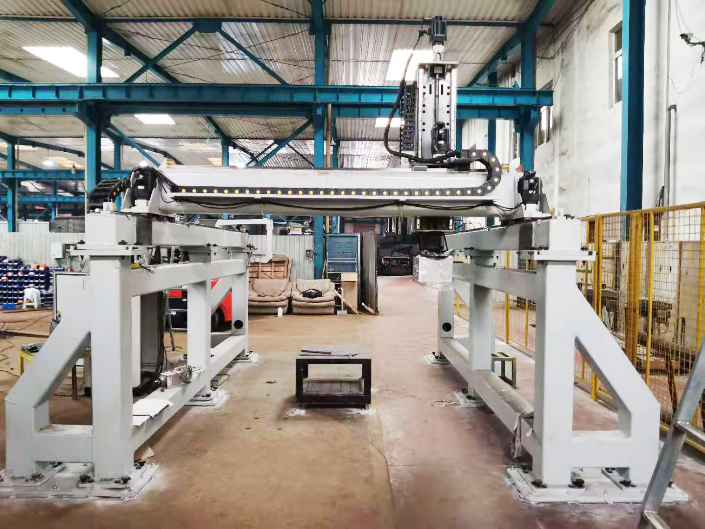 桁架机器人,又常常被称为桁架式机械手或龙门式机械手,是一种行走于桁架上的直角坐标式机械手,桁架机器人一般为X、Y、Z三轴,加持转塔式手爪,实现精准的机床装夹和收料。桁架机器人采用型材或方钢做为主框架,由镶嵌直线滑动导轨和齿轮齿条等组成。桁架机器人作为运动框架和载体的精制型材其截面形状通过有限元分析法来优化设计,生产中的精益求精确保其强度和直线度。桁架机器人有效地改善了作业环境,提供零件加工数字化、信息化、少人化直至无人化管理,可靠地保证了产品质量,极大地提高了 劳动生产率,将工人从繁重的体力劳动中解放出来,使现代制造技术达到一个崭新的水平。