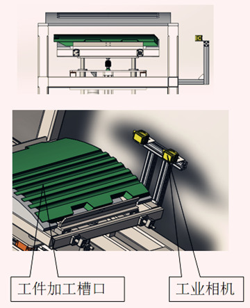 工件加工完毕后,工件回到上料初始位,工业相机安装到工件侧面,拍摄工件侧面,相机阵列做标定,通过视觉软件系统自动数据分析,分析槽口的位置及大小的加工精度。