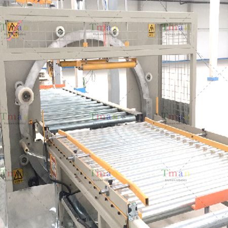 工艺流程:叉车移入产品-产品自动流入移载机-移载取板-产品定位自动进入覆膜机-自动覆膜后流入移载机-自动堆垛-顶升转向-进入缓冲区(10米长)-自动流入阻挡位置。