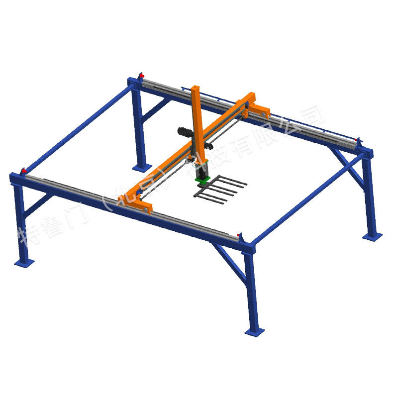 整体方案是由四轴桁架机械手、货叉组成,能够同时叉起3件产品,且与原设备不产生干涉。