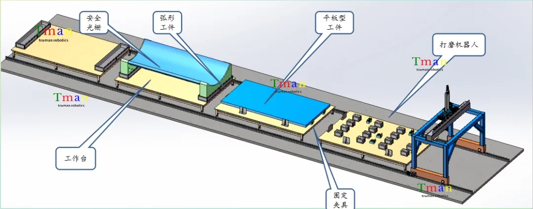 整体实施方案是由打磨工作台(工位根据现场而定)、打磨机械手、工件固定模具、工件固定夹具及除尘设备等组成。