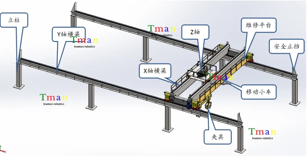 该桁架机械手由立柱、横梁、移动小车、夹具等构成,具体可参看下图: