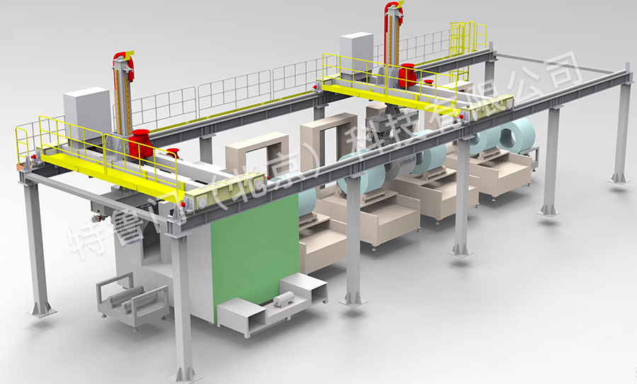 该桁架机械手是双Z轴桁架机械手,可以自动抓取铜箔卷搬运到指定位置,实现铜箔卷缓存区智能调度。设备工作范围大,动作灵活,快速高效。