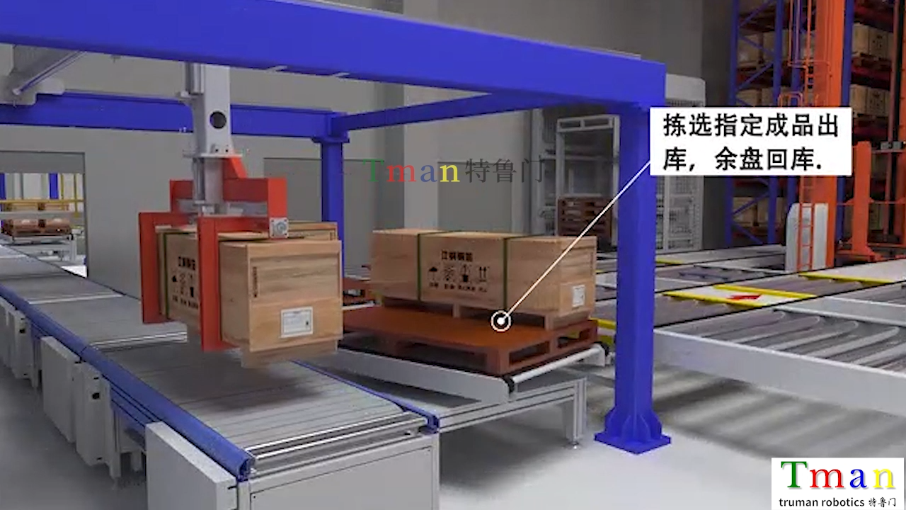 托盘将木箱送达指定位置后,桁架机械手按照系统指令,拣选指定成品,将木箱搬运移动到对应输送线,余盘回库,进行下一个产品搬运。