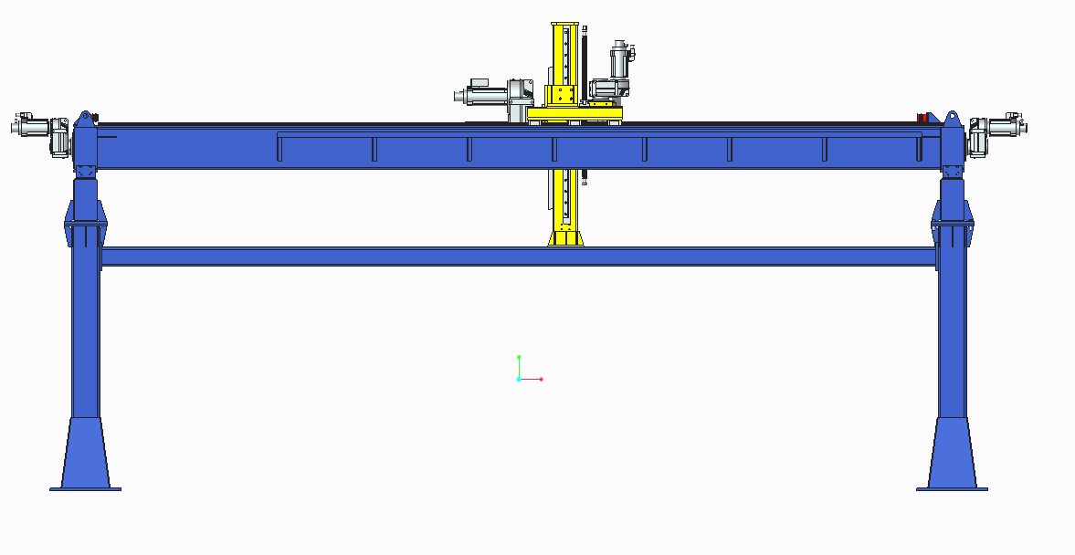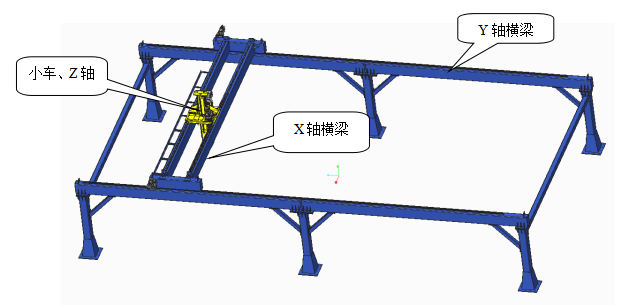 X轴、Y轴采用双梁结构,由矩形钢管制作而成,抗弯性好,结构美观;立柱由方形钢管制作而成。