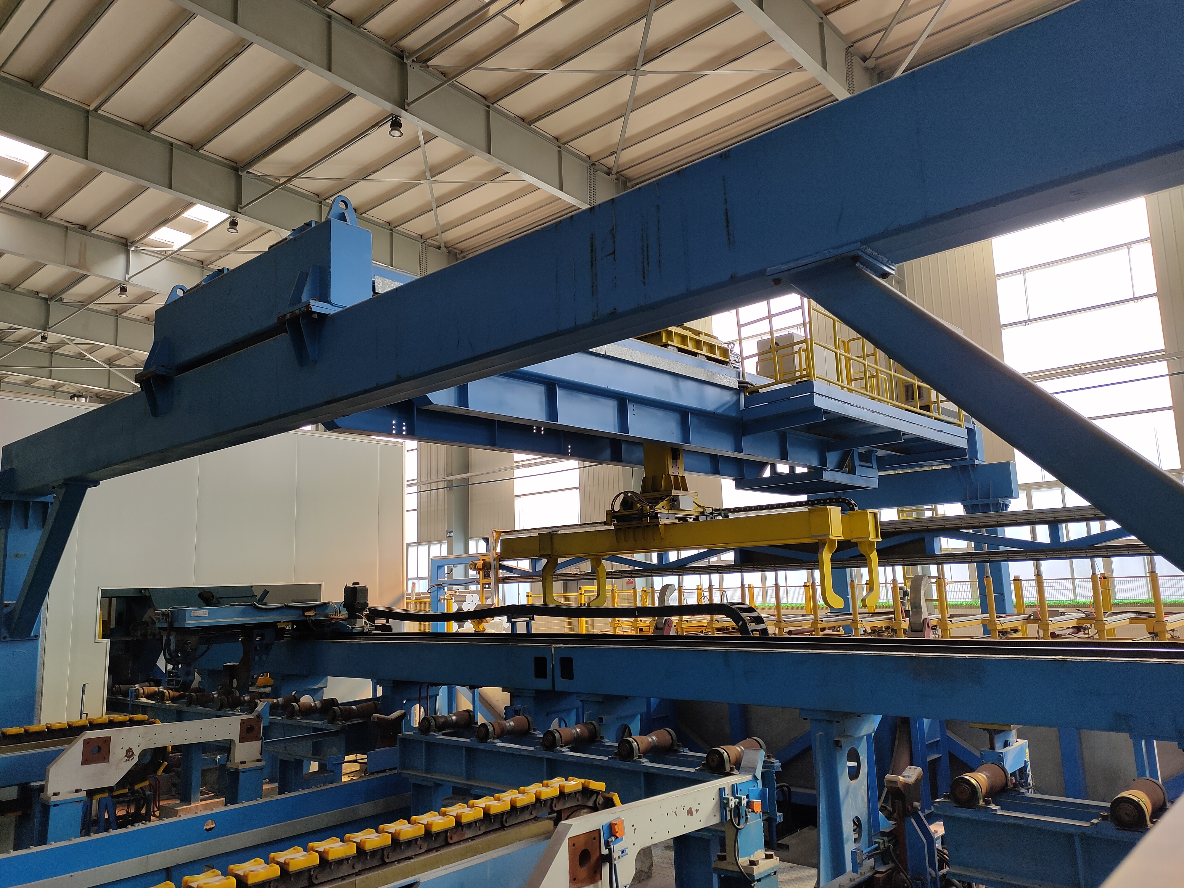 移动部件为质量较轻的十字滑座和Z向滑枕,滑枕采用由铝合金拉制的型材。横梁采用方钢型材,在横梁上安装有导轨和齿条,通过滚轮与导轨接触,整个机械手都悬挂在其上。