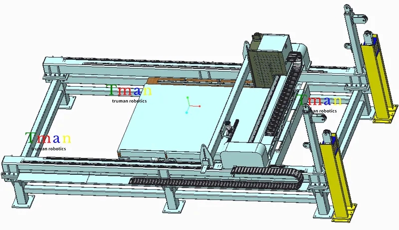 桁架机器人可以给各个生产容器装载不同的工件,也可以将生产中的成品、半成品进行装卸车作业、装卸窑作业等。