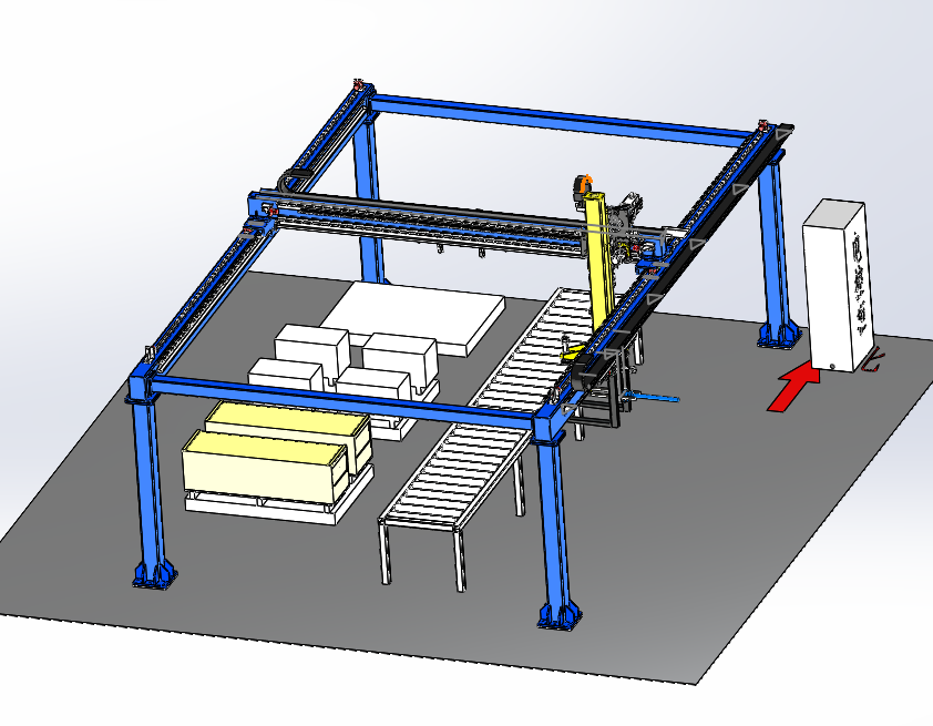 木箱下线机械手 参数表 外形尺寸(mm) 7820x5270x4200 设备总重 3.6吨 总功率 10.5KW 电压 三相380V 额定载荷 900kg 定位精度 ±1mm X轴行程 6000mm X轴速度 0.8m/s Y轴行程 4000mm Y轴速度 0.9m/s Z轴行程 500mm Z轴速度 0.2m/s R轴旋转 90° R轴旋转时间 3s 型号 TM-HJ-6m/4m/0.5m/R90°-900kg